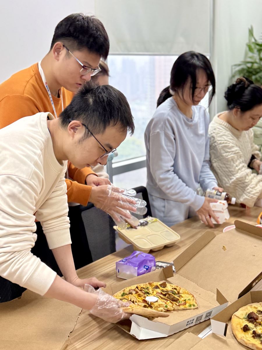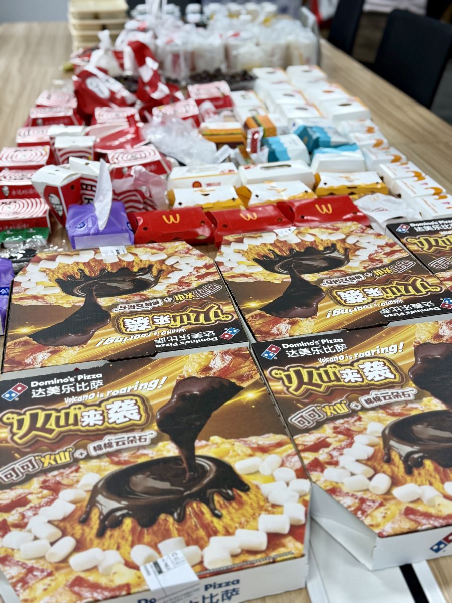 室内一角,长桌上摆满了丰富的美食:金黄酥脆的披萨香气扑鼻,鲜红饱满的车厘子如宝石般点缀其中,还有热腾腾的盒饭与大家熟悉的肯德基经典小食。饮品区供应着各式茶水饮料,满足不同口味。而最引人注目的当属甜品区——榴莲蛋糕浓郁独特,柚子蛋糕清新爽口,两款风格迥异的蛋糕并置,恰如公司多元包容的文化氛围。